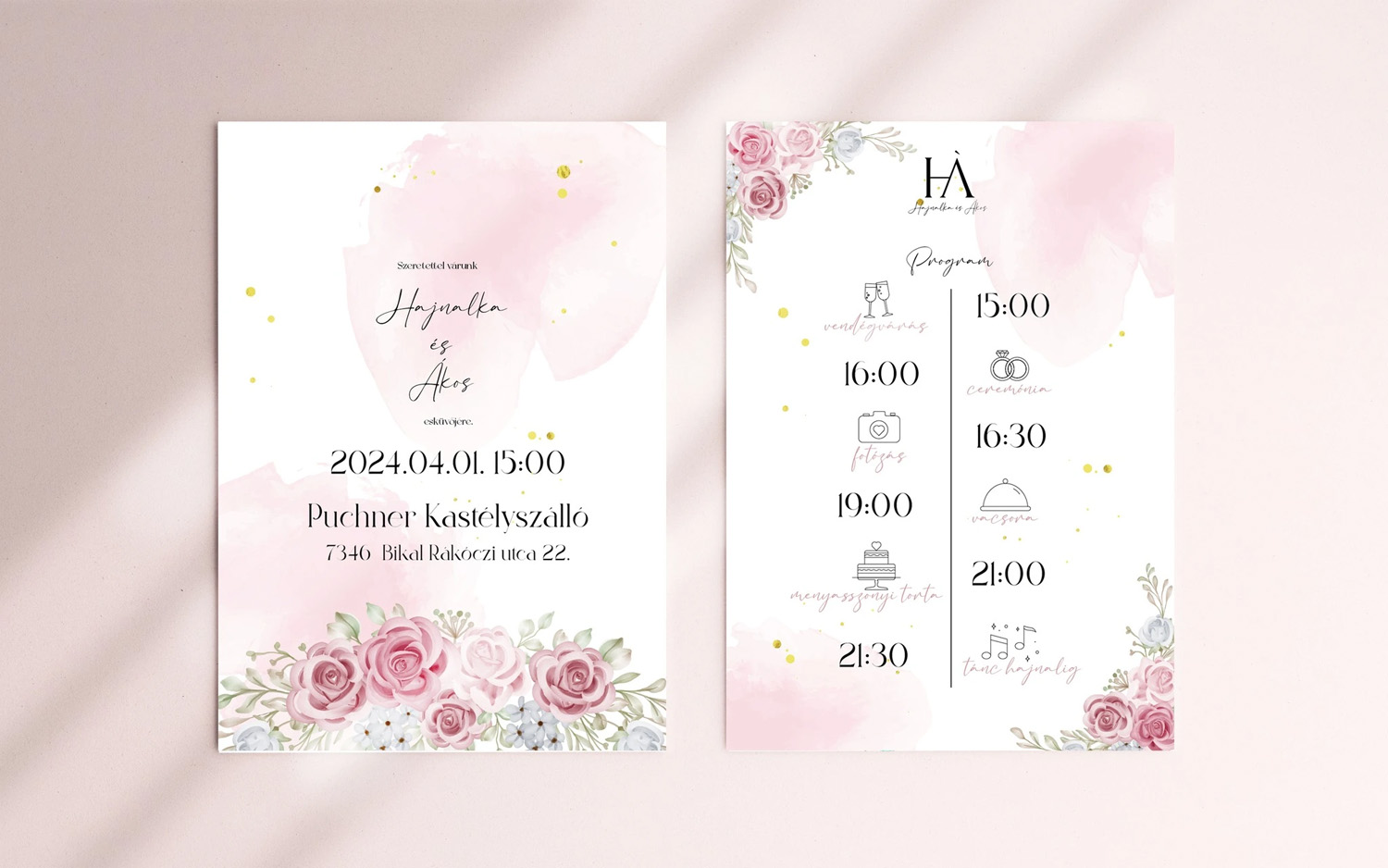 Az esküvői grafikák általában kinyomtatható digitális fájlok formájában kerülnek átadásra, így te magad döntheted el, hogy milyen anyagra nyomtatod ki őket. Általában ajánlott minőségi papírt vagy kartont választani. Ebben is örömmel segítek!:)