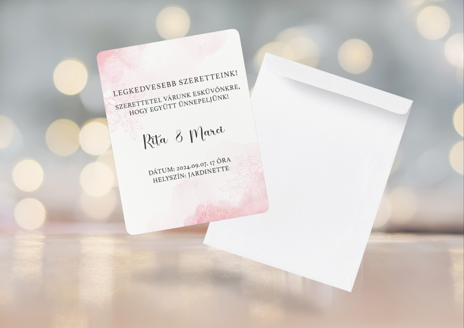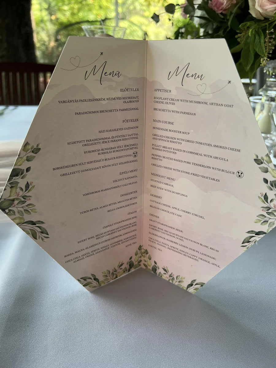 Átbeszéljük melyik legyen a végleges esküvői grafika (meghívó, menü, ültetőkártya, welcome tábla). Ha minden stimmel, elküldöm Nektek és a nyomdának a végső változatokat professzionális nyomdai formában.