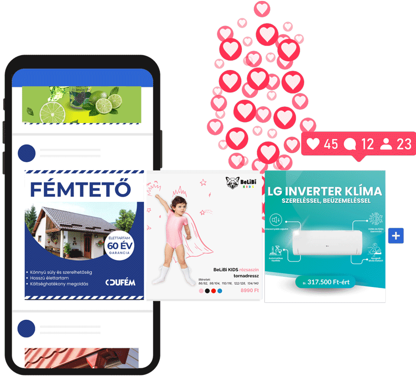 Vállalkozásod számára akár heti rendszerességgel, vagy havi 1-2 alkalommal is készítek posztot. Emellett sztorikat is tervezek, hogy hirdetés képeid még közelebb kerüljenek a célközönségedhez és még hatékonyabbak legyenek. Ezzel leveszek egy terhet a válladról, neked csak át kell nézned illetve elfogadni az ötleteimet én minden mást intézek. Kreatívabb, és egyszerűbb tartalmakat is tudok alkotni illetve videós/animált tartalmakat is. A célom az, hogy a grafikai megoldásaim segítségével kiemelkedj a tömegből és emlékezetessé válj a közösségi média platformokon is.